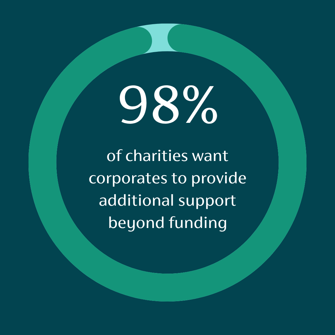 - 98% of charities want corporates to provide additional support beyond funding